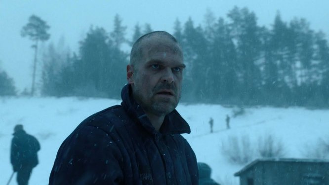 Тем временем в Камчатке Хоппер, измученный, но несломленный, выживает в советской тюрьме. Его заставляют сражаться с Демогоргоном, которого русские держат для экспериментов. С помощью Джойс и Мюррея он устраивает побег, и вместе они уничтожают чудовище, параллельно разрушая часть лаборатории. Эта сюжетная линия наполняет сезон героизмом и человеческим теплом — Хоппер и Джойс наконец воссоединяются после долгой разлуки.