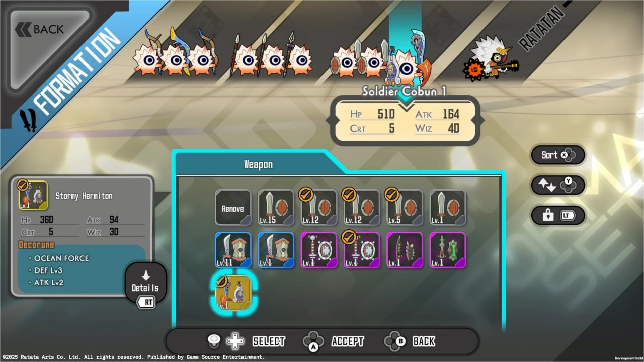 В Ratatan также присутствует множество улучшений, которые делают игру полноценным представителем жанра roguelight. Основная система прокачки универсальна: за собранные сладости можно усиливать уровни в забегах, добавляя на них источники лечения, или увеличивать численность кобунов — это название войск, которыми управляют рататаны. Причём прокачать можно как стартовое количество бойцов, так и их максимальный предел. Кроме того, есть более индивидуальные улучшения, связанные с уникальным оружием. Кобунов можно экипировать найденными или изготовленными предметами, которые изменяют их характеристики. Это снова отсылает к Patapon — разработчики даже обещают в будущих обновлениях добавить шапки, а пока доступны только оружие и его апгрейд. Любое оружие можно улучшать с помощью других, ненужных предметов, повышая его уровень: с ростом уровня улучшаются характеристики и открываются пассивные навыки.